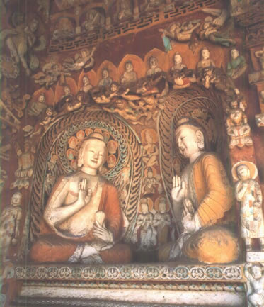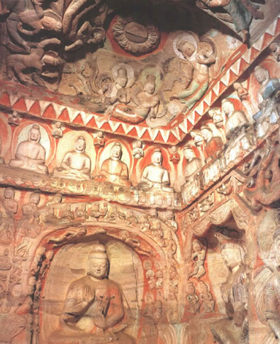 后室北壁頂部三角紋帶雕刻之下有上、下兩層大龕,下龕為圓拱龕,高4米,龕內(nèi)雕坐佛。上龕為盝形帷幕龕,龕內(nèi)中央為倚坐佛,兩側(cè)各有一交腳菩薩,最外兩側(cè)為思惟菩薩。龕楣十二格內(nèi)各雕一身飛天,龕楣上方雕有十四身伎樂天。