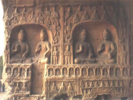 拱門高3.1米,寬2.25米。外側(cè)雕刻尖形門楣,內(nèi)飾忍冬紋。門外西側(cè)崩塌,經(jīng)近期修補,東側(cè)現(xiàn)存一力士,風(fēng)化嚴(yán)重。拱門西壁下部風(fēng)化嚴(yán)重。中部北側(cè)雕一圓拱龕,內(nèi)為坐佛。龕外兩側(cè)各雕一脅侍菩薩。龕楣內(nèi)雕七佛,龕兩側(cè)各雕五重千佛龕。中部南側(cè)雕一方形龕,內(nèi)為坐佛,龕外兩側(cè)各雕一脅侍菩薩。上層為方形帷幕龕,西壁雕坐佛坐于蓮座之上,兩側(cè)各雕一脅侍菩薩,南、北兩壁各雕一立佛,下雕蓮座。拱門東壁中、下部雕零散小龕,風(fēng)化嚴(yán)重。上部北側(cè)雕三層佛塔一座,塔下雕一圓拱龕,內(nèi)為坐佛。南側(cè)雕一盝形帷幕龕,內(nèi)為交腳菩薩,龕南側(cè)崩塌,F(xiàn)存北側(cè)一思惟菩薩與飛天。龕楣方格內(nèi)雕坐佛。 |