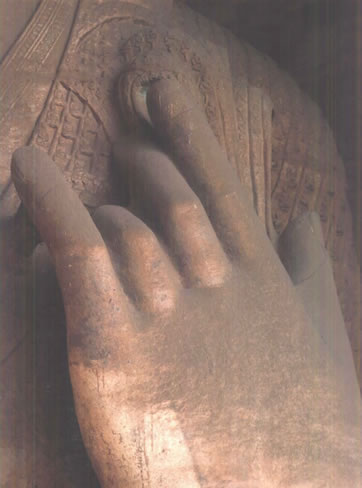 露天大佛高約13.7米,端坐于石臺座之上。佛首磨光肉髻,方圓面相,廣額豐頤,眉眼細(xì)長,鼻梁挺直,大耳垂肩;眉間施白毫,嘴唇略薄,唇上、下巴有八字胡須。眼中瞳孔為琉璃鑲嵌,大約是在遼代安裝。佛身挺拔壯碩,兩肩寬厚,著袒右肩式袈裟。袈裟質(zhì)地厚重,衣褶自然流暢,具有犍陀羅造像遺風(fēng)。大佛內(nèi)衣輕薄貼體,整體疏密得當(dāng),雕刻工藝精湛。大佛神情莊嚴(yán),慈祥泰然,結(jié)跏趺坐,雙手于腹間相會疊加,呈禪定手印?上植颗c雙腿風(fēng)雨侵蝕,雕飾全無。但是大佛姿態(tài)雄偉,氣宇軒昂,生氣勃勃,融合東西方雕塑藝術(shù)于一體,是兼?zhèn)淞朔鹜印叭、八十種隨形好”的造像珍品。