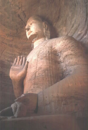 早期石窟:即今第16~20窟,亦稱為曇曜五窟。根據(jù)《魏書·釋老志》(卷114)記載:“和平初,師賢卒。曇耀代之,更名沙門統(tǒng)。初,曇耀于復(fù)法之明年,自中山被命赴京,值帝出,見于路,御馬前銜耀衣,時人以為馬識善人,帝后奉以師禮。曇曜白帝,於京城西武州塞,鑿山石壁,開窟五所,鐫建佛像各一,高者七十尺,次六十尺,雕飾奇?zhèn),冠于一世!蔽闹杏浭龅拈_窟五所,就是當(dāng)時著名的高僧曇曜就選擇了鐘靈毓秀的武州山,開鑿了雄偉壯觀的曇曜五窟,揭開了云岡石窟開鑿的序幕。第16~20窟即帝王象征的曇曜五窟,以造像的風(fēng)格和創(chuàng)作的技法來看,是云岡全窟群中最早的五個窟。平面為馬蹄形,穹隆頂,外壁滿雕千佛。主要造像為三世佛(過去、現(xiàn)在、未來),佛像高大,面相豐圓,高鼻深目,雙肩齊挺,顯示出一種勁健、渾厚、質(zhì)樸的造像作風(fēng)。其雕刻技藝?yán)^承并發(fā)展了漢代的優(yōu)秀傳統(tǒng),吸收并融合了古印度犍陀羅、秣菟羅藝術(shù)的精華,創(chuàng)造出具有獨特的藝術(shù)風(fēng)格,這是中外融合所形成的新的藝術(shù)風(fēng)格。