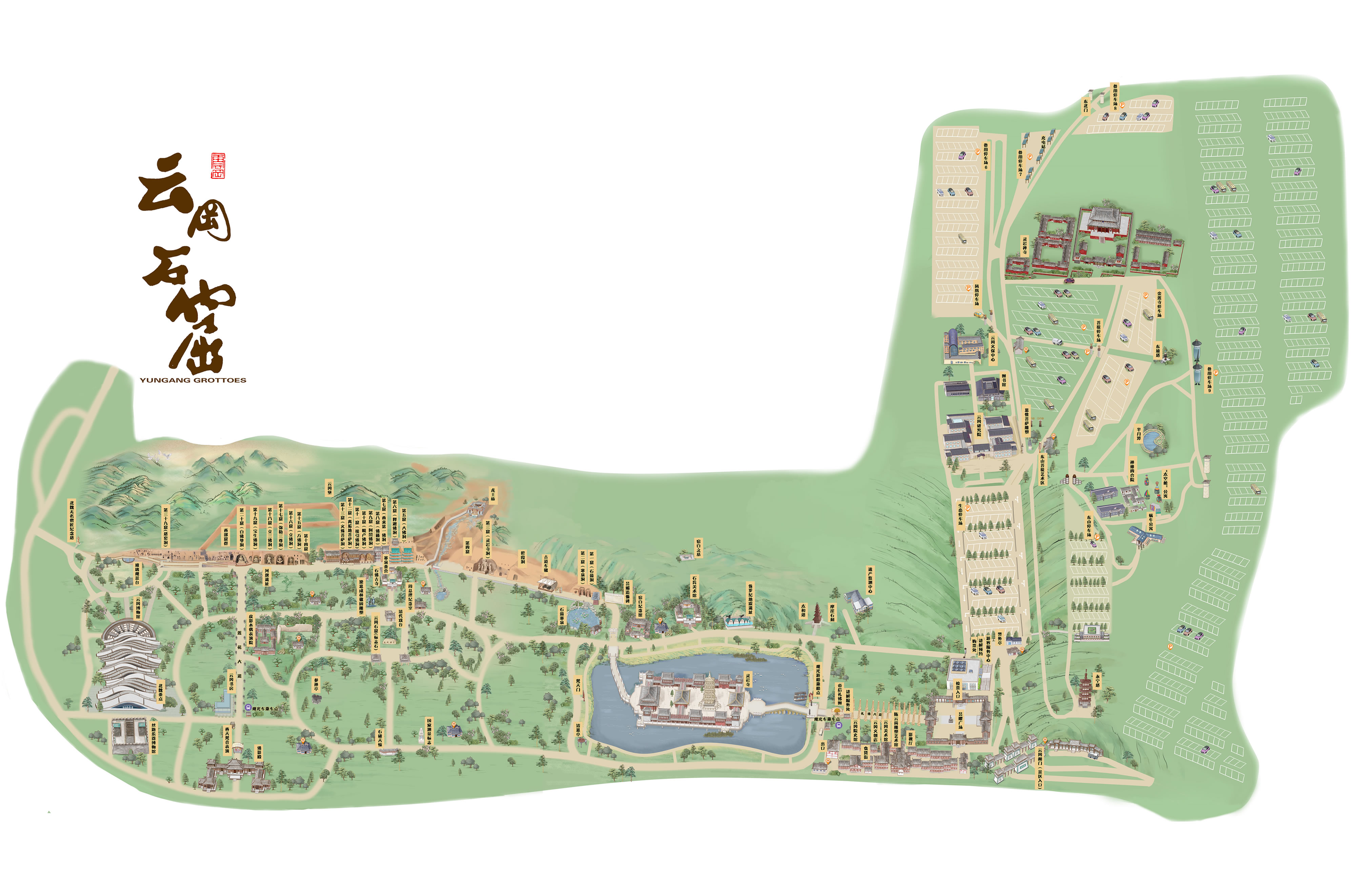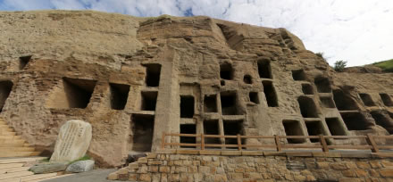 云岡石窟位于中國山西省大同市城西約16公里的武州(周)山南麓、武州川的北岸。石窟依山開鑿,規(guī);趾搿鈩菪蹨,東西綿延約1公里,窟區(qū)自東而西依自然山勢分為東、中、西三區(qū),F(xiàn)存主要洞窟45個,附屬洞窟209個,雕刻面積達(dá)18000余平方米。造像最高為17米,最小為2厘米,佛龕約計1100多個,大小造像59000余尊。云岡石窟距今已有1500年的歷史,是佛教藝術(shù)東傳中國后,第一次由一個民族用一個朝代雕作而成皇家風(fēng)范的佛教藝術(shù)寶庫,是公元5世紀(jì)中西文化融合的歷史豐碑。1961年3月被國務(wù)院公布為首批全國重點文物保護(hù)單位;2001年12月被聯(lián)合國教科文組織批準(zhǔn)列入“世界文化遺產(chǎn)”名錄;2007年5月成為國家首批5A級旅游景區(qū)。