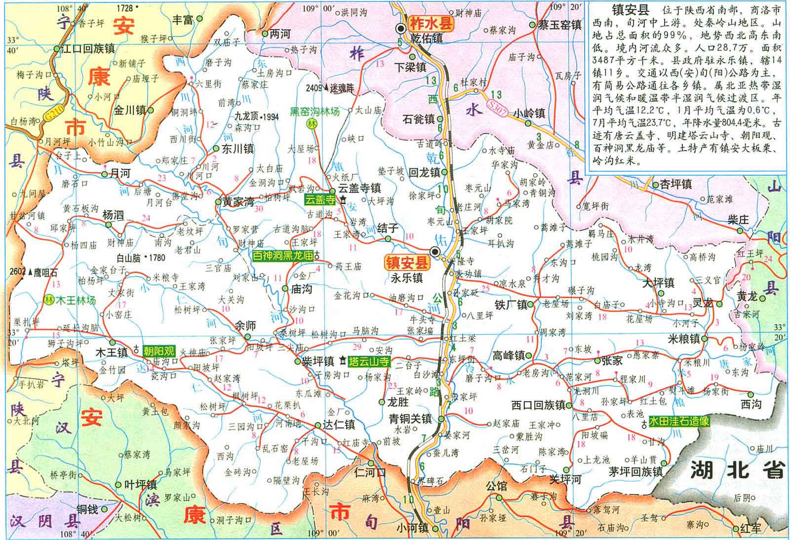鎮(zhèn)安縣位于秦嶺東段南麓, 位于北緯33.8'至33.48"57',東經(jīng)108 34"35'至109 36"51'。距陜西省西安市195公里,離商洛市178公里。面積3487平方公里。縣委、縣政府駐地永樂鎮(zhèn)(謝家彎)縣城前街188號。境內(nèi)最高點(diǎn)為楊泅鄉(xiāng)鷹嘴石,海撥2601.6米,最低點(diǎn)是龍勝鄉(xiāng)詢河村河谷,海撥344米,高低落差2257.6米,地勢西北向東南傾斜;屬長江水系漢江支流;年均降雨量804.4毫米,年平均氣溫12.2℃,屬亞熱帶半濕潤氣候。