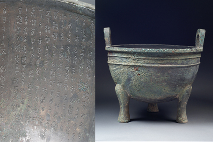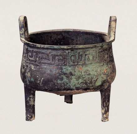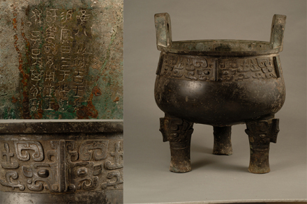 鑄于周康王時(shí)期,造型敦厚雄偉,紋飾莊重神奇。通高77厘米,口徑56.5厘米。立耳,深腹,平沿方唇,三柱足?谘叵嘛椄〉駹铟吟鸭y,地襯細(xì)雷紋。三足根部飾大饕餮面。雙耳外側(cè)各飾一條曲體上緣的夔龍。腹外壁及底部厚積煙跡,顯系長(zhǎng)期使用所致。腹內(nèi)壁鑄有銘文28字。旟鼎承襲商代圓鼎風(fēng)格,造型厚重莊嚴(yán),紋飾十分精美,所刻銘文是研究周初土地制度的重要史料,具有珍貴的歷史及藝術(shù)價(jià)值,加之鑄刻時(shí)代明確,被公認(rèn)為周康王時(shí)的標(biāo)準(zhǔn)器,是一尊著名的西周時(shí)期的國(guó)寶。