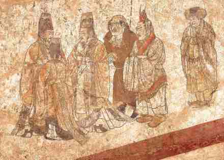 高185厘米,寬247厘米。繪于章懷太子墓道東壁。畫(huà)面中共有六位人物,前三位是唐朝鴻臚寺官員,均著初唐朝服,頭戴籠冠,身穿闊袖紅袍,白裙曳地,腰系綬帶,手持笏板,足登朝天履,呈三角狀站立。三人氣度沉穩(wěn),雍容自如,神情肅穆,面面相對(duì),似乎正在商討事宜。后面三位,為首一人推斷應(yīng)是來(lái)自東羅馬的使節(jié)。中間一人推斷是來(lái)自朝鮮半島的新羅使節(jié)。最后一位應(yīng)來(lái)自中國(guó)東北靺鞨族。這三位使者均躬身,畢恭畢敬,謙卑的神情中流露出期盼、等待之意。