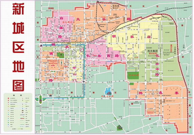 新城區(qū)轄9個街道:西一路街道、長樂中路街道、中山門街道、韓森寨街道、解放門街道、自強路街道、太華路街道、長樂西路街道、胡家廟街道。
