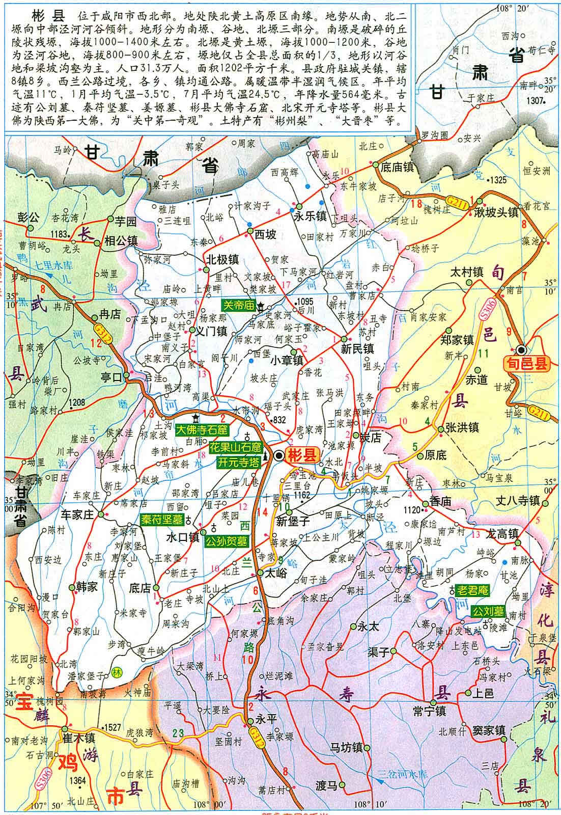 彬縣位于陜甘兩省交界處,南距咸陽120公里、西安150公里,北距甘肅平?jīng)?60公里,是連接秦隴的咽喉要道。全縣版圖形似正寫的“人”字,涇河自西而東斜貫其中,將全縣分為南北兩塬一道川。全縣轄8鎮(zhèn)8鄉(xiāng)246個行政村,總人口32萬,其中農(nóng)業(yè)人口28.8萬,總面積1183平方公里,耕地面積60萬畝。彬縣歷史悠久,是中國古代農(nóng)業(yè)的發(fā)祥地之一。