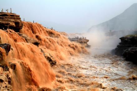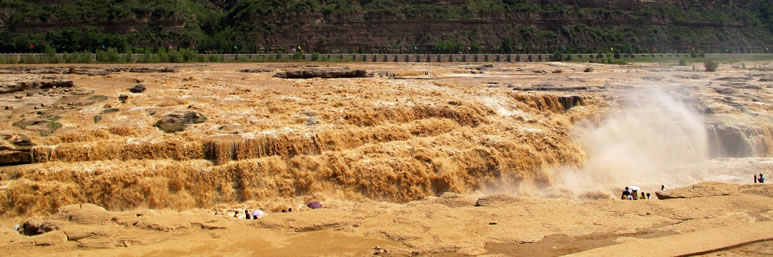 黃河在延安市延川縣眼岔寺鄉(xiāng)馬家騫村入區(qū)境,自北而南沿東界流經延長縣安河、羅子山、南河溝,在宜川縣猴兒川口出境,長183千米。在宜川縣城東48千米處,黃河由200—300米寬收縮到50米,突然跌入34米深的壺形峽谷,形似巨壺沸騰,十分壯觀,稱之為宜川壺口瀑布。