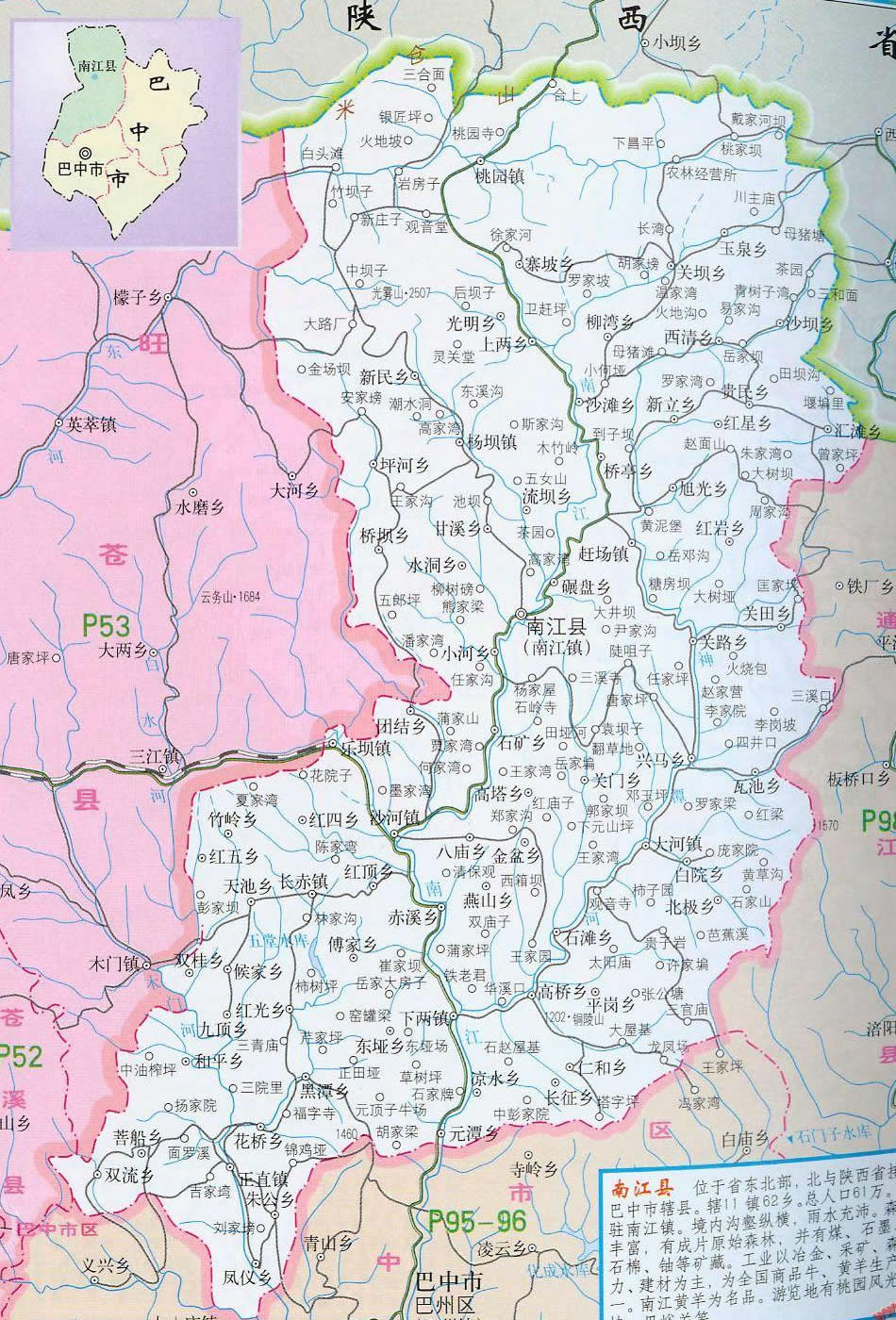 南江縣位于四川北緣米倉山南麓,東鄰通江,南接巴州,西界旺蒼,北靠陜西省南鄭縣。南江古屬巴國,后為集州,先秦兩漢就有政區(qū)建置。南北朝時期的梁普通六年(公元525年)始建難江縣(取江水難涉之意),距今1480年,明正德十一年(公元1516年)改難江縣為南江縣(江水繞城南而名)至今。 幅員面積3383平方公里,有耕地42.3萬畝;總人口65萬人,總戶數20.2萬戶。全縣轄48個鄉(xiāng)鎮(zhèn),522個村,2408個村民小組,86個居民委員會。