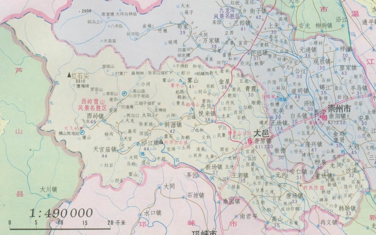 鎮(zhèn):晉原鎮(zhèn)、王泗鎮(zhèn)、出江鎮(zhèn)、西嶺鎮(zhèn)、斜源鎮(zhèn)、董場(chǎng)鎮(zhèn)、韓場(chǎng)鎮(zhèn)、三岔鎮(zhèn)、上安鎮(zhèn)、蘇家鎮(zhèn)、新場(chǎng)鎮(zhèn)、安仁鎮(zhèn)、悅來(lái)鎮(zhèn)、青霞鎮(zhèn)、沙渠鎮(zhèn)、蔡場(chǎng)鎮(zhèn)、花水灣鎮(zhèn)