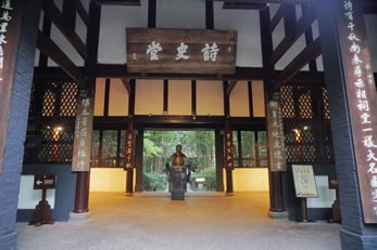 詩(shī)史堂是中軸線上的第三重建筑,也是主體建筑。杜甫留下的1400多首詩(shī)歌,真實(shí)而生動(dòng)地展現(xiàn)了“安史之亂”前后唐代社會(huì)生活畫卷,反映了唐朝由盛轉(zhuǎn)衰的歷史。杜甫被后世尊為“詩(shī)圣”,他的詩(shī)歌被稱為“詩(shī)史”, “詩(shī)史堂”也因此得名。大廳的正中陳列著一尊由我國(guó)著名雕塑家劉開(kāi)渠先生以寫實(shí)的手法來(lái)刻畫的杜甫塑像。