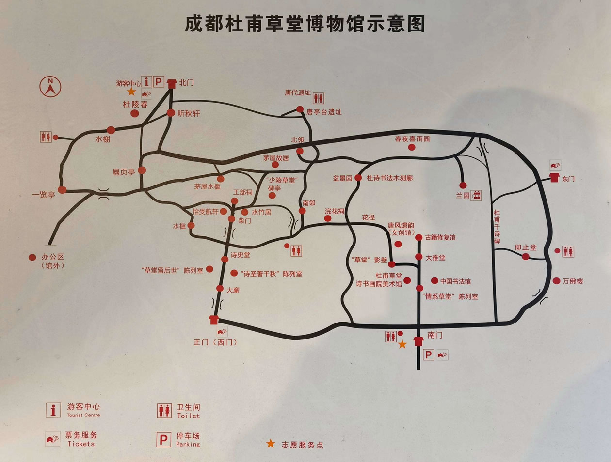 博物館按功能區(qū)分為:文物景點(diǎn)游覽區(qū)(草堂舊址)、園林景點(diǎn)游覽區(qū)(梅園)和服務(wù)區(qū)(草堂寺)。草堂舊址內(nèi),照壁、正門、大廨、詩(shī)史堂、柴門、工部祠排列在一條中軸線上,兩旁配以對(duì)稱的回廊與其它附屬建筑,其間有流水縈回,小橋勾連,竹樹(shù)掩映,顯得既莊嚴(yán)肅穆、古樸典雅而又幽深靜謐、秀麗清朗。工部祠東側(cè)是“少陵草堂”碑亭,象征著杜甫的茅屋,已成為杜甫草堂的標(biāo)志性景點(diǎn)和成都的著名景觀。