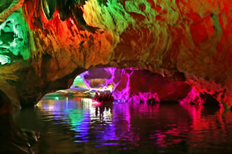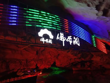由南天門往右,沿著崎嶇的“盤陀路”進(jìn)入第二殿,隨著“一柱廳”、“半天山”到達(dá)約有450平方米寬的“東海龍宮”那里“定海神針”直立,“五彩神泉池”水色清澈晶瑩,不寒而栗有“白龍?jiān)浇瓓Z寶”、“頑猴望”、“海獅戲蓮”、“別甲神鷹鎮(zhèn)金沙”、“龍王百寶箱”等天然造型,氣勢(shì)磅礴,極為壯觀。龍宮內(nèi)洞中有洞、景中有景。“武陵園”有牛角尖、簸箕天,海螺洞中有“鶴蚌相爭”、“海螺觀戰(zhàn)”、“鳴鑼助戰(zhàn)”、“石床”等石筍、鐘乳石造型,相映成趣,目不暇接。然而,“山有洞天不算奇,陰河劃船數(shù)第一”。沿著灣灣曲曲的跳蹬路,耳聽潺水聲,觀看“地海橫鯨”、“青蛙駝蓮”、“天地桃”、“美猴照鏡”等景點(diǎn)來到陰河劃船處——“凱旋門”、只見幽幽碧水,微泛漣漪,各種燈光倒映水中的燈景冉冉浮動(dòng)。