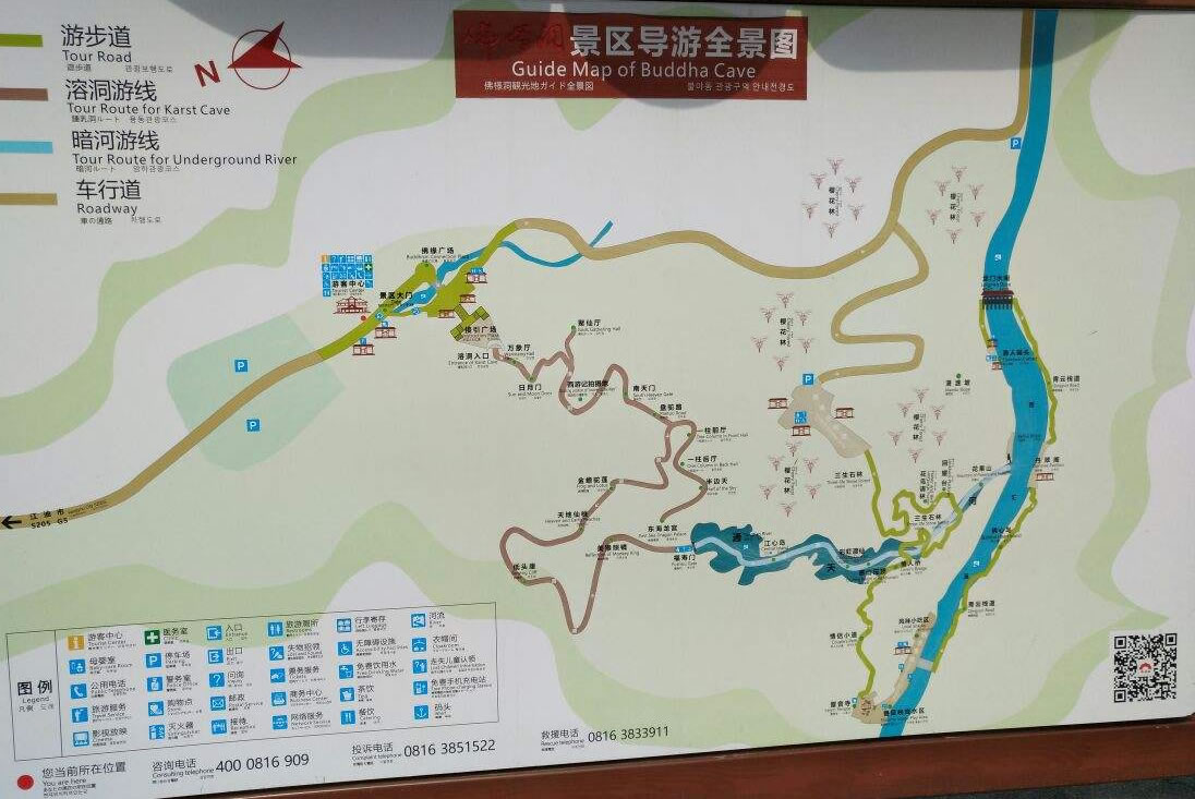 整個(gè)旅游區(qū)域以佛爺洞為主,其余的七仙洞、牛角洞、西方境等正逐步開發(fā)。佛爺洞由三廳、兩廊、一河構(gòu)成,全長三千余米,洞內(nèi)景點(diǎn)六十多個(gè)。全洞從上至下共分三層,第一層從“佛手迎客”至“南天門”。此層涼風(fēng)習(xí)習(xí),沁人心脾,滌蕩塵心。步入此層,迎面便是一只巨大佛手從洞頂伸出,歡迎你的到來。接著便是“三心堂”,所為三心及天心、地心、人心。還有“圣燈”、“金猴撈月”、“菩蒂樹”、“鯉躍觀柳”等栩栩如生的景點(diǎn)。行至前方,左有園盤皎陽,右有彎鉤銀月,名曰“日月門”。過此門沿石階面下,道旁有頭戴銀盔、身披鎧的“巨靈神”把守仙境要道。右方大廳石壁上一條巨蛇從洞內(nèi)伸頭欲奔,一只大龜頭頸長伸,狀若賽跑,對(duì)面石壁上老壽星美鬢長飄、笑容可掬觀看比賽,人們稱之為“龜蛇奔天門”。要道左方可觀看到:“雄獅騰空”、“千佛巖”、“達(dá)摩廊壁”、“靈芝山”、“神鷹回首”、“玉杯”、“金山、銀山”、“鋸臺(tái)”、“天橋”等惟妙惟肖的鐘乳石造型,恰似一幅璀燦奪目的藝術(shù)浮雕。