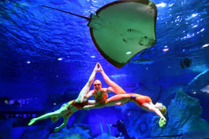 徜徉于多彩的海底世界,一覽多彩珊瑚、熱帶魚群以及兇猛的鯊魚構(gòu)成的海底世界。美麗的俄羅斯水秀演員、童話里的美人魚,搖曳身姿,共同舞動海底深處的視覺奇跡。探訪深海的馴養(yǎng)師也將攜手兇猛鯊魚,演繹人鯊共舞。