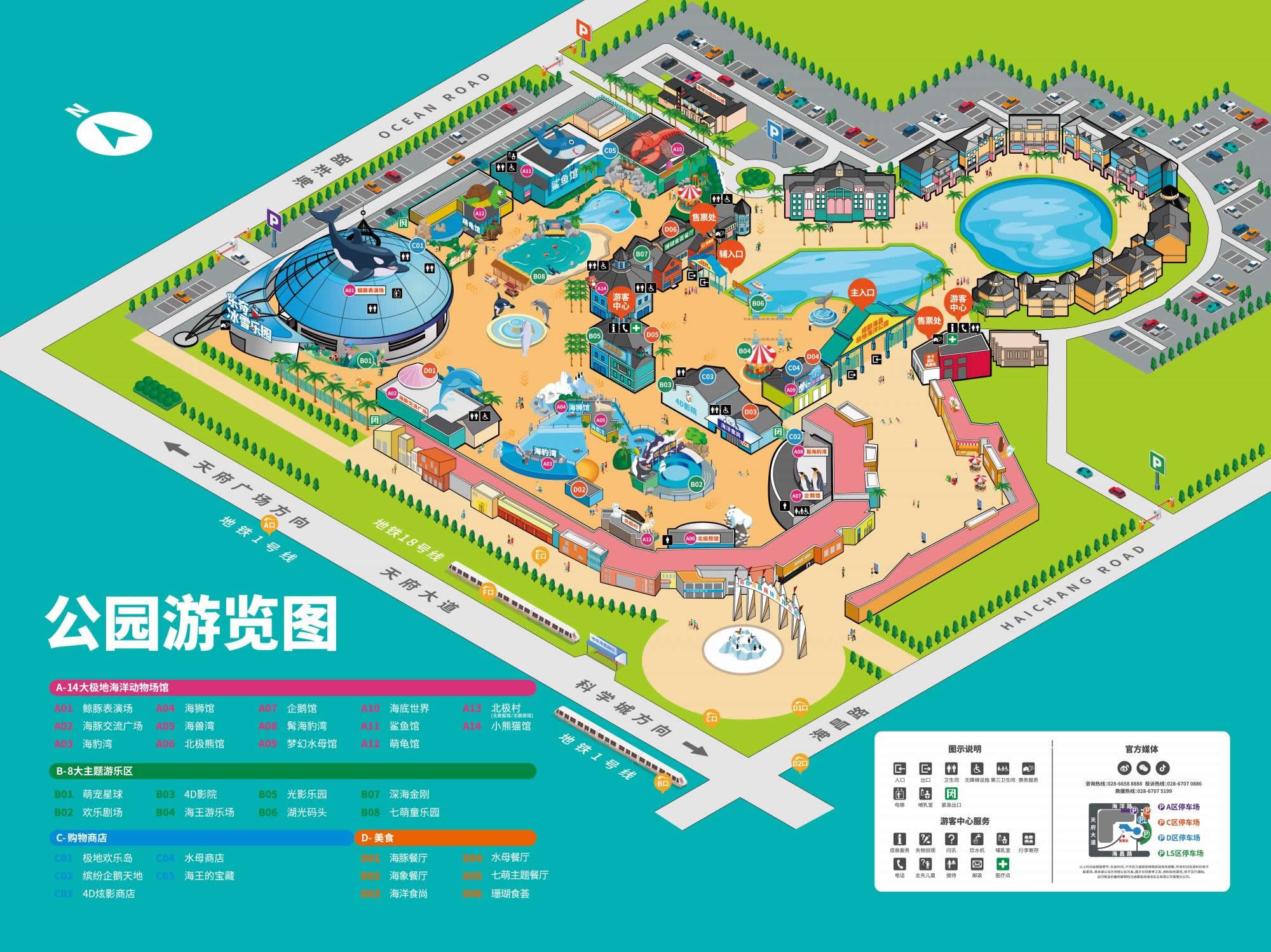 作為承載科普、互動、歡樂、體驗為一體,戶外游樂區(qū)+室內(nèi)動物場館+大型演藝場結(jié)合的海洋主題公園,成都海昌極地海洋公園擁有鯨豚(白鯨、海豚)、北極熊、企鵝、海豹、海獅、萌龜、水母、北極狐、北極狼、小熊貓 [4] 等14大海洋動物場館,以及海王游樂場(器械游樂設備)、萌寵星球(水陸空動物互動區(qū))、光影樂園、4D影院、深海金剛科技體驗館、七萌童樂園(夏季為親水玩水區(qū))等8大主題游樂區(qū)。游客入園,還能欣賞到《鯨豚聯(lián)盟》、《人鯊共舞》、《海獅運動會》等海洋科普秀,夏日還有快樂無比的國際花車巡游和戲水狂歡限時上演。