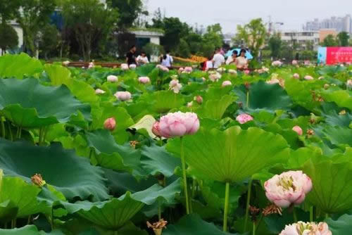 工程實行24小時全天作業(yè)。經過緊張有序的施工建設,荷花種植面積共約619畝。計劃種植荷花約20萬株,荷花育苗工作已全面完成,絕大部分已長出嫩芽,成活率達99.9%。此外,涉水基礎項目水下主體已基本完工,光彩亮化項目預計6月底基本完工,市政、綠化項目的重要節(jié)點部分在7月底亮相。預計8月初向市民開放。