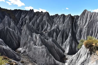 八美石林由三疊紀(jì)板巖構(gòu)成。受第四紀(jì)以來(lái)的新構(gòu)造運(yùn)動(dòng)影響,沿康定—道孚—爐霍一線形成了著名的鮮水河斷裂帶,斷裂帶中的巖石,受到擠壓、剪切,發(fā)生破碎、糜化,形成構(gòu)造糜棱巖,它在八美附近最為典型和集中。斷裂活動(dòng)形成的糜棱巖由于青藏高原隆升而被暴露出地表,這些膠結(jié)疏散的糜棱巖,遭受流水的沖刷,風(fēng)雪的鏟刮,重力崩塌等風(fēng)化作用,就形成了狀若石林。因這種巖石軟弱且含鈣質(zhì),大自然風(fēng)雨流水的侵蝕便把它雕塑成了千姿百態(tài)、雄奇壯觀的土石林景觀。