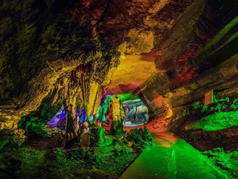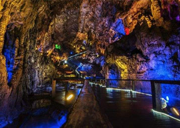 位于牛角嵌北3500米,可游面積約7萬平方米,由三殿、七庭和“洞中西!、“洞中棧道”等十二大景觀組成。主洞深2000余米,高30—80米,洞內(nèi)塔柱林立,陰河幽邃,四壁乳石滿布,形狀神奇,氣勢宏偉,置身洞中,令人頓覺莊嚴(yán)肅穆。其中的“乳石蓮花”、“定海神針”、“珍珠玉盤”、“金龜戲水”和古水文線遺跡堪稱絕景。