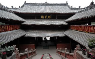 家慶堂屋頂為歇山頂,整個殿宇雄偉華麗,它的屋頂脊飾很有特色。正脊正中有三重樓閣,樓閣之上有寶頂,樓閣后底部雕塑有彌勒佛;9個脊梁之上都有蹲獸,在4個翼角戧脊之上塑有天上四靈,以正四方。什么是“四靈”呢?就是青龍、白虎、朱雀、玄武;為何要塑“四靈”?因為古人常有“左龍右虎辟不祥,朱雀玄武順陰陽”的說法。在歇山下邊的正中位置,還有“上有仙人不知老,渴飲玉泉饑食棗”等生動有趣的裝飾性塑像。如果站在代表二十四孝的石階下仰望整個家慶堂時,更會有華麗多彩、猶如海市蜃樓的感覺。