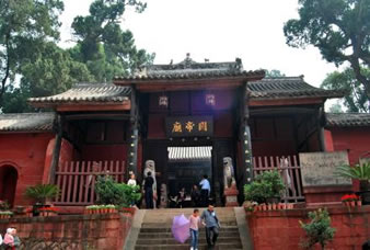 關圣殿高15米,正中為通體鎏金的關羽坐像。像高5米,寬3米,頭戴冕鎏,金臉長須,身穿繡龍袍,衣紋流暢自然,腰束玉帶,手執(zhí)牙笏,通體鎏金,神情威嚴,一幅帝王模樣。這尊泥塑關羽坐像造型古樸莊嚴,有專家認為,此像為全川現(xiàn)存關羽造像最佳作品之一。