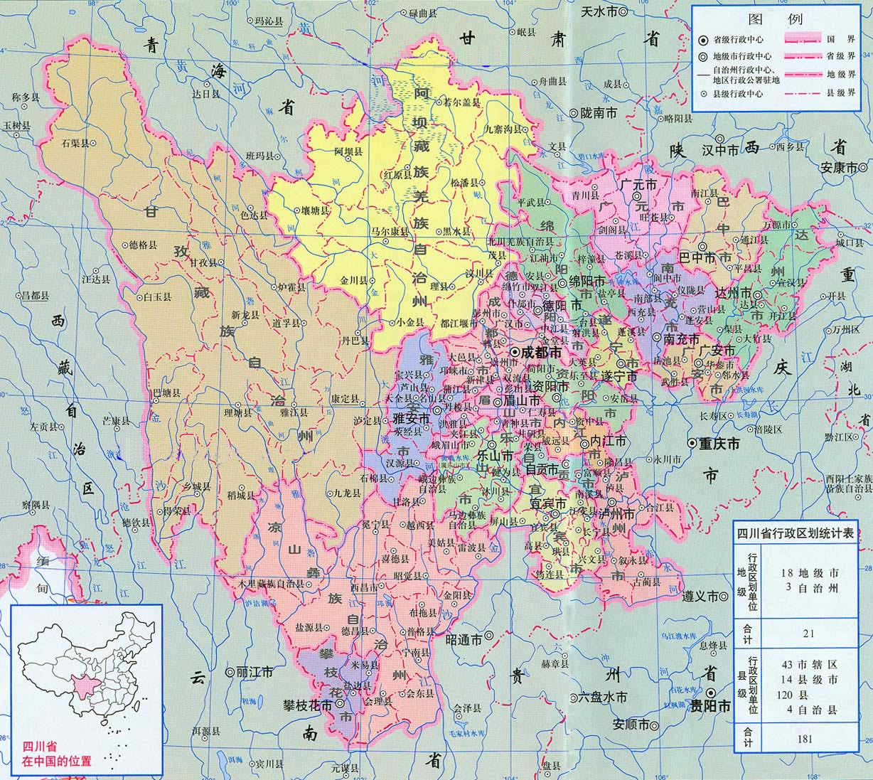 四川位于中國中部偏西,長江上游,簡稱川或蜀,省會成都市。西為青藏高原,東有長江三峽,北有秦嶺巴山,南為云貴高原,與鄂、湘、黔、滇、藏、青、甘、陜省區(qū)相鄰,是聯(lián)接中國西南、西北和華中三大地區(qū)的天然紐帶。