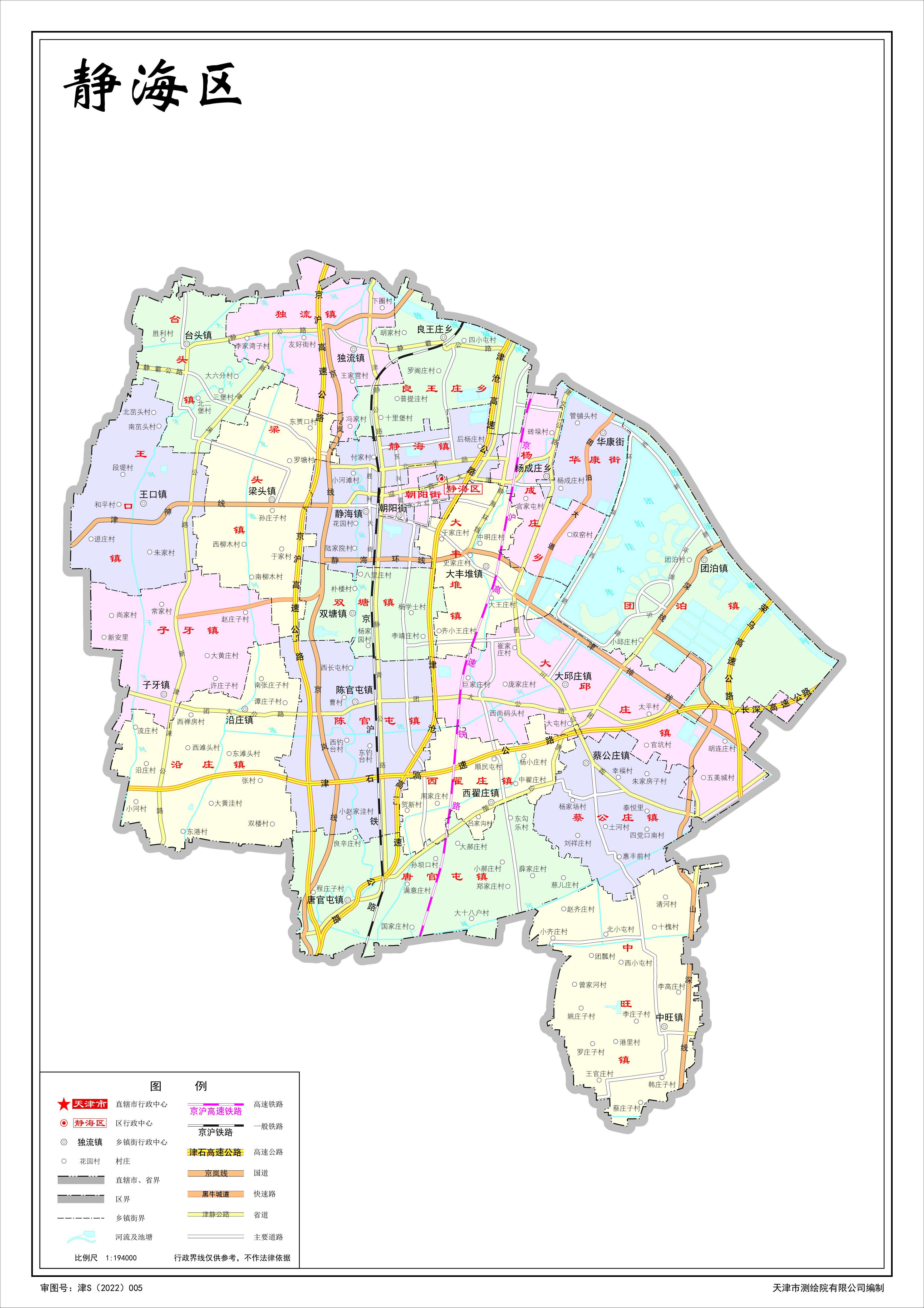 鎮(zhèn):靜海鎮(zhèn)、唐官屯鎮(zhèn)、獨(dú)流鎮(zhèn)、王口鎮(zhèn)、臺(tái)頭鎮(zhèn)、子牙鎮(zhèn)、陳官屯鎮(zhèn)、中旺鎮(zhèn)、大邱莊鎮(zhèn)、蔡公莊鎮(zhèn)、梁頭鎮(zhèn)、團(tuán)泊鎮(zhèn)、雙塘鎮(zhèn)、大豐堆鎮(zhèn)、沿莊鎮(zhèn)、西翟莊鎮(zhèn)