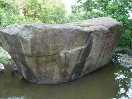在東西浮青嶺之間山谷中,兩邊是險(xiǎn)峻的陡壁,清秀的峰巒,澗谷中彎曲的小溪,清流湍急。當(dāng)?shù)罊M臥一石,長(zhǎng)數(shù)丈,高丈余,上寬下窄,形同元寶,名元寶石,上鐫“此地有崇山峻嶺,怪石奇松。古檀寧椿,“古檀”是密云。寧椿是名字。古密云縣的一位舉人經(jīng)過(guò)這里,被盤(pán)山的美景吸引住了,他想用一句話來(lái)概括盤(pán)山的勝景,于是他便借用了晉代著名書(shū)法家王羲之的《蘭亭序》中有“此地有崇山峻嶺,茂林修竹”一句,他看到盤(pán)山松樹(shù)長(zhǎng)勢(shì)奇特,巖石形狀怪異。因而在這里留下了“此地有崇山峻嶺,怪石奇松”。