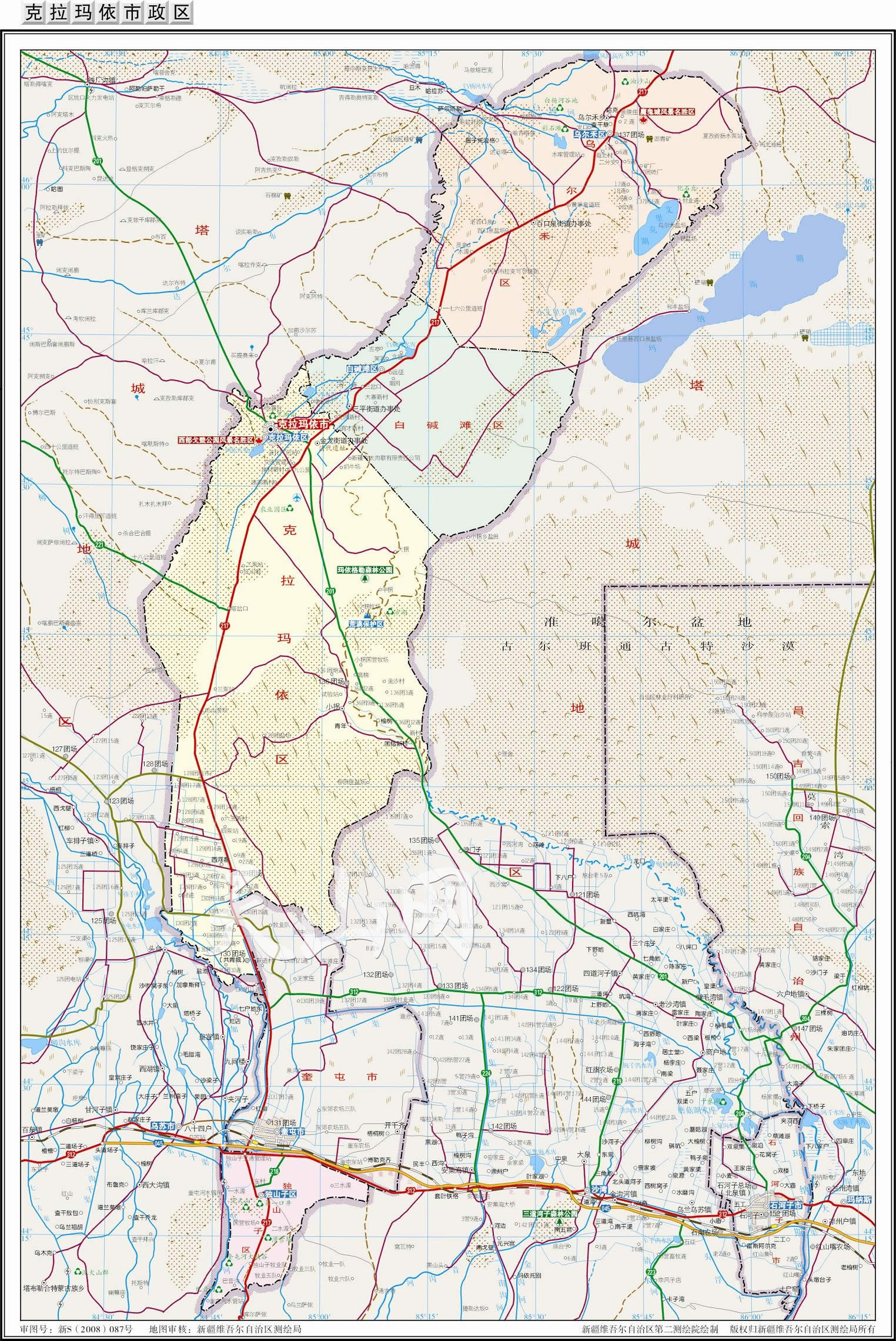 克拉瑪依區(qū) 面積3833.4平方千米,人口261712,政府駐天山路42號(hào),下轄7個(gè)街道、1個(gè)鄉(xiāng)