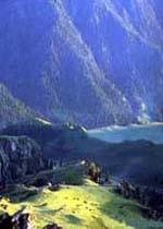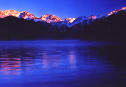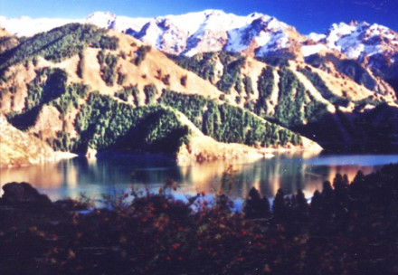 三江河洪水:即“南湖黃龍”,三江河水從大天池南段入湖處,由于博格達(dá)山區(qū)夏季降水較多,常暴雨盆潑,三工河上游集水面積有168平方公里,河水每當(dāng)大雨洶涌北瀉,從天池北南望。