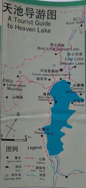 燈桿山(禪燈山):海拔2718米,在距大天池西岸約4公里處(一說三公里),山體呈南北走向,長3公里許,寬約2公里,可游面積0.2平方公里,是天池西側(cè)群峰第二高峰,屬中山峽谷森林帶;山上有大片牧場(chǎng),老君廟、東岳廟均建于此,過去曾有道士在山頂立一上掛天燈的松桿,晝夜不滅預(yù)示世道太平,又稱太平燈;燈桿山是極佳的觀景地,上可遙望博格達(dá)雪峰、下可俯瞰天池全貌,“西山觀松”和觀看日落等也是絕佳的位置;由此西眺,烏魯木齊可盡收眼底,尤其在夜晚華燈初上之際,可遠(yuǎn)觀烏魯木齊萬家燈火。相傳這座山上立的上掛“天燈”的松桿是人們?yōu)榱思o(jì)念菩提達(dá)摩在對(duì)面的“達(dá)摩禪洞”里思考和所傳的禪法。循大天池西側(cè)盤山公路向上數(shù)百米,見路邊“新疆瑤池國際旅行社中國天山天池馬克·鐘度假村”(內(nèi)有絲綢古道馬克鐘餐飲廣場(chǎng)等),再向上約3公里便可到達(dá)。