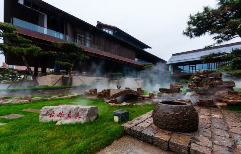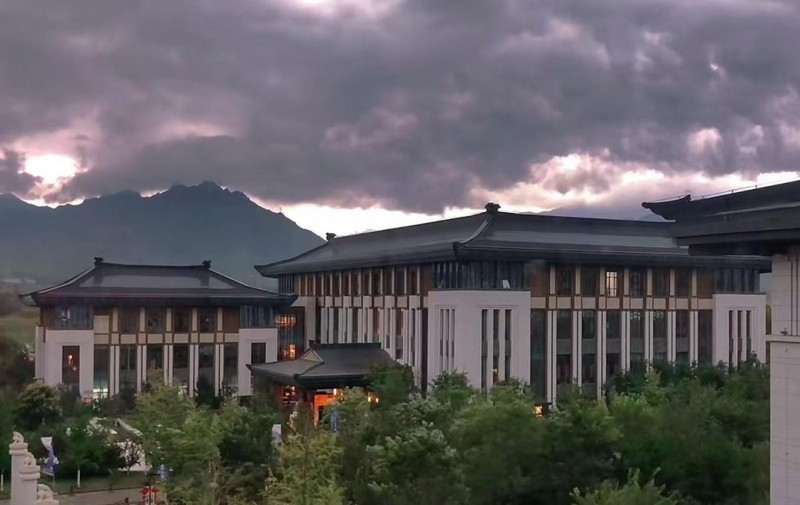 那白,不再是日光下格外耀眼的白,而是閃著被雨水調(diào)和了的,一種溫潤如玉的光澤;那瓦,也不再是樸素的灰,而是透著水光,泛著烏亮的顏色,像巨鳥收斂的羽翼,沉靜地棲息著。松風(fēng)館靜默在青松的環(huán)抱里,雨水順著松針的尖端,凝成一顆顆晶瑩的,欲墜未墜的珠子。遠遠望去,太行山原本雄渾蒼勁的輪廓,在雨幕里漸漸化作宣紙上暈開的青黛,而繚繞的云霧,恰似畫家筆下有意無意的留白。此刻,唯有雨水從高處滴落,敲在石上、葉上的聲響,正應(yīng)了那句“青松凝露翠,寒色隱泉聲”的幽靜與禪意。