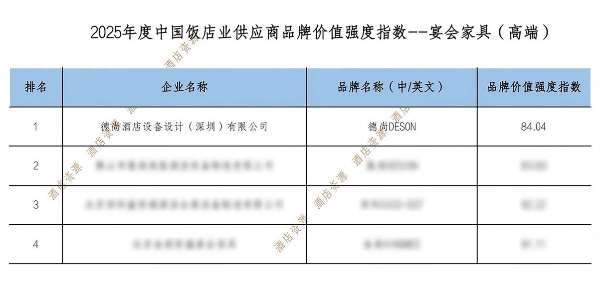 《2025年度中國飯店業(yè)供應(yīng)鏈品牌價值強(qiáng)度報告》由全聯(lián)旅游業(yè)商會住宿業(yè)分會聯(lián)合多家權(quán)威機(jī)構(gòu)共同編制,已成為酒店采購決策的重要參考依據(jù)。DESON德尚能夠?qū)崿F(xiàn)行業(yè)榜首的蟬聯(lián),關(guān)鍵在于其核心業(yè)務(wù)方向與酒店業(yè)發(fā)展訴求形成深度契合。