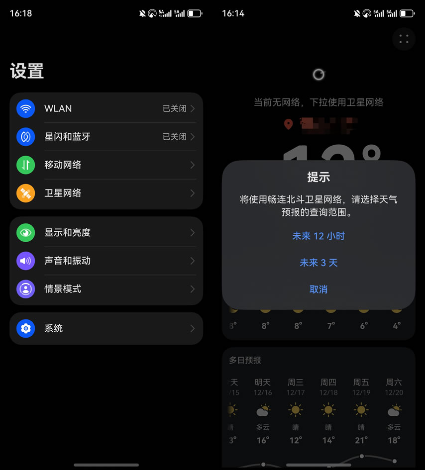 哪怕?tīng)I(yíng)地完全沒(méi)有信號(hào),現(xiàn)在也不用慌。有網(wǎng)絡(luò)時(shí)提前在設(shè)置-衛(wèi)星網(wǎng)絡(luò)里打開(kāi)“暢連北斗衛(wèi)星消息”后,我可以切換到衛(wèi)星網(wǎng)絡(luò)模式,能查看未來(lái)12小時(shí)、最長(zhǎng)3天的天氣數(shù)據(jù)。手里有這個(gè)戶外神器,再也不必?fù)?dān)心與世隔絕和天氣突變了。