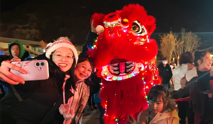 游客與度假區(qū)內(nèi)的福獅合影互動(dòng),討個(gè)新年“好彩頭”。