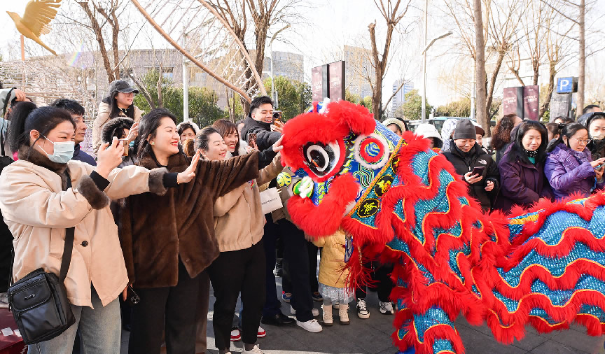 大年初一,購(gòu)物中心的舞獅隊(duì)伍來到戶外與市民互動(dòng),送上新年祝福。