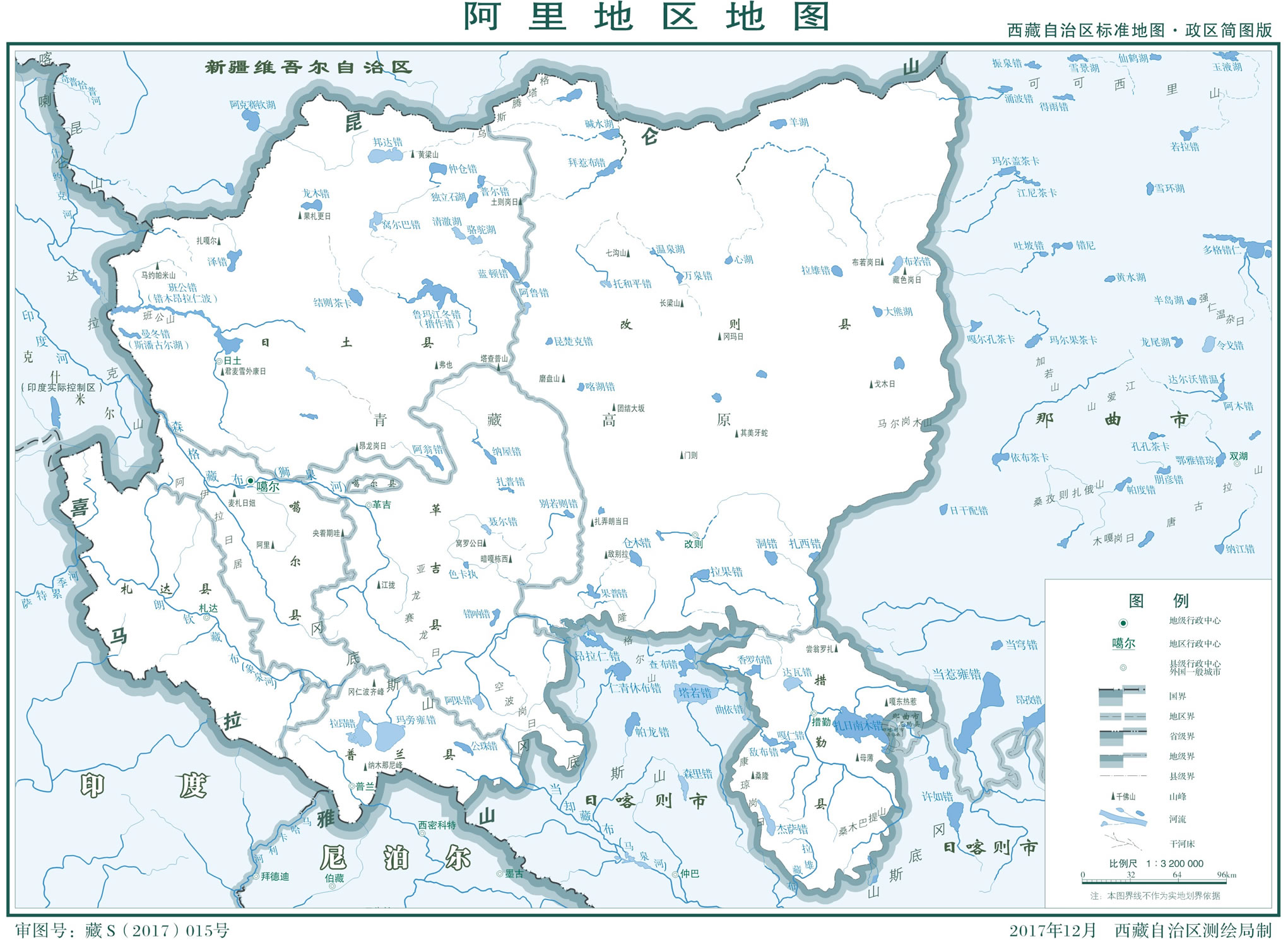 阿里地區(qū)位于中國(guó)西南邊陲、西藏自治區(qū)西部、青藏高原北部(羌塘高原)。東隔大橫山、果干加年山、馬爾崗木山、各扎山、欠甲納博山諸山,臨那曲市;東南抵岡底斯山脈中段,依日喀則市;北倚昆侖山脈南麓,接新疆維吾爾自治區(qū)和田地區(qū)、巴音郭楞蒙古自治州;西南和西部靠喜馬拉雅山脈西段,與尼泊爾、印度、克什米爾為界。東西跨度742千米,南北跨度688千米,面積33.717萬(wàn)平方千米。