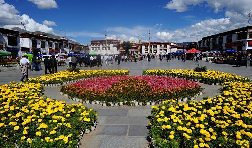 底層售票處,有樓梯可以直通二樓和三樓的平臺(tái)。在平臺(tái)上遠(yuǎn)眺:布達(dá)拉宮的建筑在耀眼的陽(yáng)光中光芒四射。俯視可以看到大昭寺廣場(chǎng)人流潺動(dòng),可盡覽充滿(mǎn)藏族生活氣息的八廓街。夏天這里還有茶座,在此可以休息。