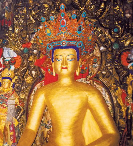 酥油燈后是大昭寺主殿正門(mén),大昭寺最早的建筑都從正門(mén)開(kāi)始;外院是后來(lái)修建、擴(kuò)充的,而主殿是1400多年前的建筑。由于多年信徒的摩擦,門(mén)口的石頭地板光亮如鏡。大殿左右各有一尊巨大的佛像。左側(cè)為紅教創(chuàng)始人密宗大師蓮花生,他本來(lái)是印度的佛學(xué)家,公元八世紀(jì)進(jìn)藏,在他入藏以后藏區(qū)開(kāi)始出現(xiàn)密宗。右側(cè)是未來(lái)佛。