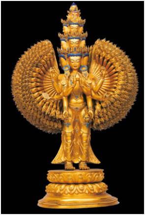 西藏本土制造的宗教文物,以金銅造像最著名。羅布林卡興建之初,七世達(dá)賴為給剛建好的宮殿佛堂添裝佛像及佛教用具,曾在布達(dá)拉宮腳下建立了一所名為“雪堆白”的造像場(chǎng),匯集了藏區(qū)內(nèi)幾百名能工巧匠,在這里精心打造各種佛像器物,以滿足拉薩及周邊地區(qū)寺院的需求。羅布林卡從初建到最后完善,每座佛堂里的大小佛像都被指定由“雪堆白”工匠量身定做打造。除此之外,園內(nèi)很多佛龕、宗教用具、金頂屋檐、門楣雕飾等,也都出自“雪堆白”工匠之手!把┒寻住痹煜裉攸c(diǎn)是制作精細(xì)、比例勻稱、色彩鮮明艷麗,佛像上的鍍金厚重,鍍金面光潔度高,佛冠、耳墜、臂釧、手鐲、飄帶等飾物,一律用綠松石鑲嵌。這些明顯特征,說明18世紀(jì)中葉以后,西藏本土佛像打造技術(shù)已步入了獨(dú)立發(fā)展的成熟階段。