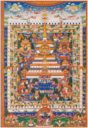 除佛像、佛塔外,唐卡收藏也是一大亮點(diǎn)。羅布林卡珍藏了大量18到20世紀(jì)勉唐畫派、欽則畫派和嘎赤畫派的各類作品。早期唐卡著名的有覺仲師徒像、帕木竹巴·多吉杰布像、印度尊者比瓦巴、那若巴像。其中覺仲師徒像唐卡,描寫的是印度尊者,噶當(dāng)派始祖阿底峽向貼身弟子仲敦巴(師徒合稱“覺仲”)傳授佛法的故事。畫面中心主尊阿底峽頭戴錐形遮耳帽,身披袈裟,雙手結(jié)說法印,給身旁仲敦巴講法,仲敦巴著藏式袍服,結(jié)跏趺坐,側(cè)身聆聽大師教誨。畫面上、下分別繪有如來、藥師、觀音、度母諸佛及繪畫施主像,人物刻畫逼真、栩栩如生,背景以朱砂填色,輪廓用金線勾勒。這件13世紀(jì)繪制的“赤唐”作品,十分稀有,彌足珍貴。另外,在收藏諸多的嘎赤畫派作品中,以84位印度大成就者唐卡最具特色。這些唐卡的畫面,不同以往其他畫派作品,構(gòu)圖較為簡(jiǎn)潔,色彩淡雅。人物形態(tài)被描繪的極為夸張,塑造了一個(gè)個(gè)特殊而詼諧逗趣的大成就者形象。這種一反常態(tài)的畫風(fēng)作品,在外邊難得一見。還有以唐卡形式繪制的《四部醫(yī)典系列掛圖》,收藏也比較完整。系列掛圖,藏族稱為“曼唐”,它是以彩色連環(huán)畫形式系統(tǒng)描述了藏醫(yī)藥學(xué)的基本理論,人類解剖構(gòu)造,生理功能、疾病診斷治療方法,各種藥物種類以及人類如何養(yǎng)生保健、飲食搭配等內(nèi)容。“曼唐”制作完善于清代五世達(dá)賴?yán)锇⑼迳<未雸?zhí)政時(shí)期。最早成79幅,1916年十三世達(dá)賴?yán)锪钊擞衷鲅a(bǔ)了一幅“歷代西藏名醫(yī)圖”,形成80幅。這批系列掛圖,被視為標(biāo)準(zhǔn)藍(lán)本,完整保存在羅布林卡內(nèi)。
