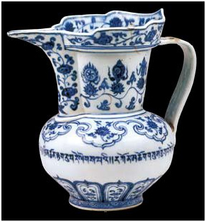 明宣德時(shí)期(公元1426年--1435年)贈(zèng)送的青花纏枝蓮紋僧帽壺,高23cm,底徑9cm。該壺是仿藏傳佛教僧人的僧帽所制,故稱“僧帽壺”。壺的通體飾青花紋樣,腹部書寫一圈藏文,意為“晝吉祥、夜吉祥、正午吉祥、晝夜吉祥、三寶吉祥”。但這圈銘文中的藏文字母和分隔符號(hào)書寫有誤,可見這是不通藏文的漢族工匠仿書。足墻飾美麗的卷草紋,器底青花雙圈書寫兩行六字“大明宣德年制”。宣德青花瓷以其古樸典雅的造型,晶瑩艷麗的釉色,多姿多彩的紋飾聞名于世。宣德時(shí)期西藏與內(nèi)地往來綿密,大量的青花瓷做為皇帝贈(zèng)品傳入西藏。西藏上層為保存這些瓷器不致受損,還用金屬或皮革制成瓷套盛裝。此件瓷壺從造型到紋飾,多含西藏元素,顯然它是朝廷命景德鎮(zhèn)官窯專門燒制贈(zèng)予西藏上層的。