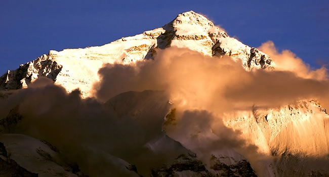 珠穆朗瑪峰地區(qū)及其附近高峰的氣候復雜多變,即使在一天之內,也往往變化莫測。大體來說,每年6月初至9月中旬為雨季,強烈的東南季風造成暴雨頻繁,云霧彌漫,冰雪肆虐無常的惡劣氣候。11月中旬至翌年2月中旬,因受強勁的西北寒流控制,最低氣溫可達-50℃,平均氣溫在-30℃左右。最大風速可達90米/秒。每年3月初至5月末是風季過渡至雨季的春季,而9月初至10月末是雨季過渡至風季的秋季,在這兩個季節(jié)期間,有可能出現(xiàn)較好的天氣。