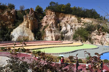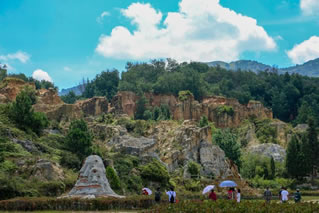 該沙林因風(fēng)化剝蝕而成,為層巒壘峰狀;又因其以紅、黃、白為主色調(diào),雜以青、藍(lán)、黑、灰色,加上季節(jié)、氣候、日照及觀賞角度的不同,產(chǎn)生絢麗多彩的色調(diào),故名彩色沙林,是著名的地質(zhì)旅游景觀。