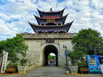 南城樓稱雙鶴樓又稱承恩樓。南城門是古城四門之首,始建于明洪武十五年(1382年),為古城最古老雄偉的建筑,是大理古城的象征和標(biāo)志。古城墻四面各長約1500米、高6米、厚達(dá)12米。城門上“大理”二字是郭沫若1961年游覽大理時(shí)親筆所提,“大理”是國號(hào),意為“大治大理,富國興邦”之意。