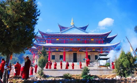 普濟寺位于麗江古城西北6千米的普濟山中,始建于清乾隆三十六年(1771年),為麗江城郊五大喇嘛寺之一,因大殿鋪蓋銅瓦面而聞名遐邇。大殿院落由山門、護法堂(門樓)、正殿、南北廂房組成四合院。正殿平面是長方形,初用土瓦覆蓋,由圣露活佛輾轉(zhuǎn)西南各地講經(jīng)、集資,于1936年改覆銅瓦,面積為46.4平方米。