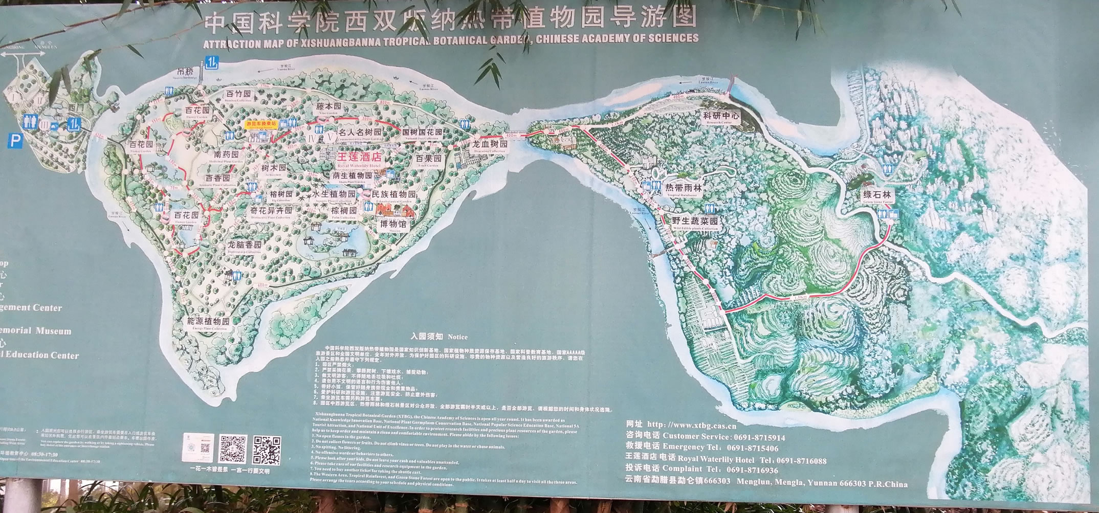 截至2015年9月,在占地面積約為11.25km2中國科學院西雙版納熱帶植物園里,收集有活植物12000多種,建有38個植物專類區(qū),還保存有一片面積約250hm2的原始熱帶雨林。
