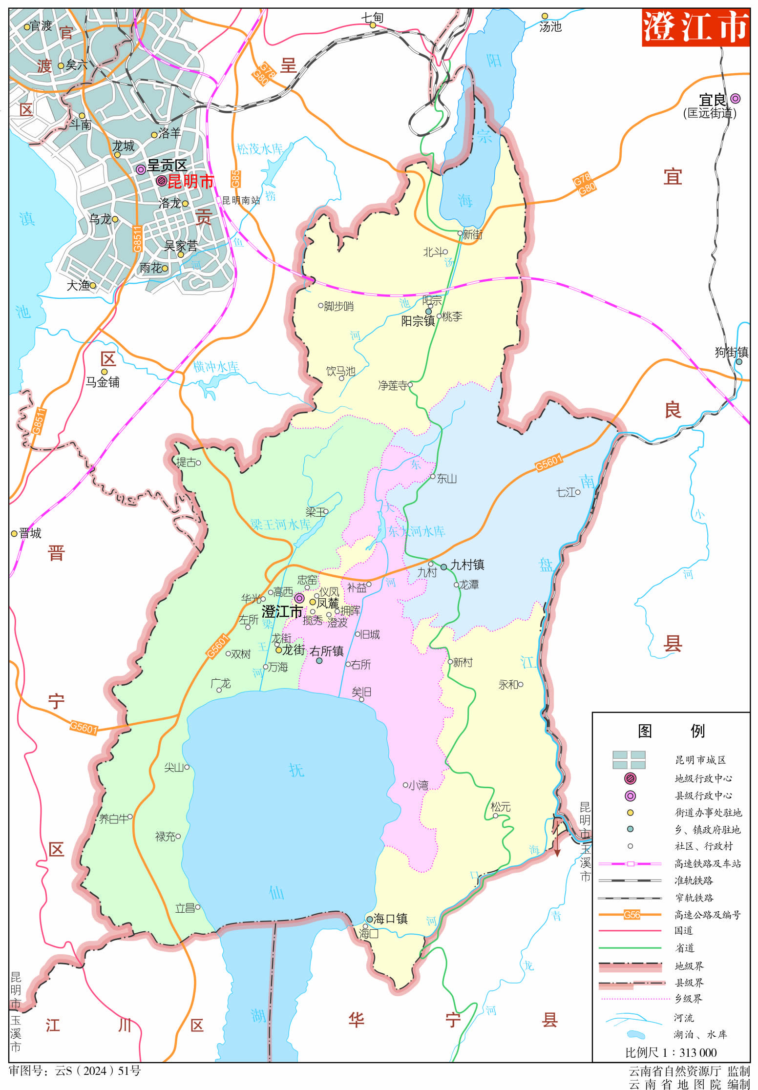 位置境域 澄江市地處滇中,位于云南省省會昆明市東南,東沿南盤江與宜良縣為界,南隔撫仙湖與江川區(qū)、華寧為鄰,西與呈貢、晉寧接壤,北含陽宗海與昆明市呈貢區(qū)、宜良縣毗連。距昆明市區(qū)52千米,距玉溪市區(qū)87千米,總面積916平方千米。