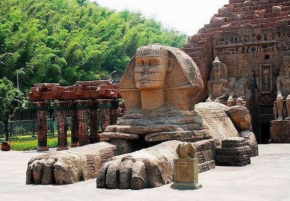 漫漫黃沙中,那宏偉的建筑,依稀就是魂?duì)繅?mèng)繞已久的胡夫大金字塔和守護(hù)它數(shù)千年的獅身人面像;燥熱暖風(fēng)里,法老們古老的咒語,斷斷續(xù)續(xù)飄來,召喚著我們不由自主的向前,渴望一探究竟。坐上埃及的太陽船,穿過金字塔黑暗的甬道,危險(xiǎn)的鬼屋,劈波斬浪的剎那,才發(fā)現(xiàn)早已沉醉在古埃及異度時(shí)空的迷夢(mèng)中。