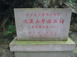 摩崖石刻是后人為緬懷徐福東渡這一歷史事件而保存下來的歷史古跡,大約刻于唐宋間,故而十分珍貴,具有極高的歷史研究?jī)r(jià)值。石刻面朝東南,高1.2米,寬3.5米,整幅畫面展現(xiàn)“人馬步金橋”、“鯉魚跳龍門”、“麟鳳呈祥瑞”等場(chǎng)面,表現(xiàn)了徐福率童男童女從達(dá)蓬山東渡出海的史實(shí),也是全國唯一幸存的反映徐福東渡的歷史古跡。清康熙庚子年僧人惠初游覽達(dá)蓬山時(shí),在其中挖了神龕,并刻有“靈臺(tái)自若”等字樣。