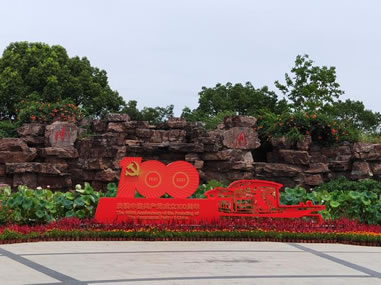 是為紀(jì)念中國共產(chǎn)黨第一次全國代表大會(huì)在南湖閉幕而建造的一座革命紀(jì)念館。作為中共“一大”會(huì)址重要場館和黨的誕生地,1959年根據(jù)有關(guān)部門的決定,經(jīng)中央審查同意,嘉興市籌建南湖革命紀(jì)念館,不僅仿制了南湖畫舫,還在湖心島建立了南湖革命紀(jì)念館,紅船?康暮男u成為最初的館舍,于煙雨樓大廳中開辟中共“一大”史料陳列。1991年7月,為慶祝中國共產(chǎn)黨成立70周年,紀(jì)念館移建南湖北岸,由鄧小平同志題寫?zhàn)^名,建設(shè)資金主要由黨員自愿捐獻(xiàn)。建成的紀(jì)念館由鐮刀、錘子形組成的紀(jì)念性建筑物,占地面積3800平方米,建筑面積1980平方米。紀(jì)念館坐北朝南,廣場上有高大威嚴(yán)的宣誓臺(tái)和大型石雕照壁以及四個(gè)火炬型花壇。在鮮花擁簇下,紀(jì)念館顯得莊嚴(yán)雄偉。沿著臺(tái)階進(jìn)入陳列大廳,正面是一艘南湖紅船模型和“中國共產(chǎn)黨第一次全國代表大會(huì)史料陳列”,兩個(gè)展廳分別布置了《中國共產(chǎn)黨第一次代表大會(huì)史料陳列》、《黨和國家領(lǐng)導(dǎo)人對南湖的關(guān)懷》等陳列,其中包括江澤民、胡錦濤、朱镕基、楊尚昆、宋平、姚依林、彭真等中央領(lǐng)導(dǎo)同志前來參觀、考察的照片和江澤民、李鵬、陳云、李先念等同志為紀(jì)念館的題詞。南湖革命紀(jì)念館是中國百個(gè)愛國主義教育基地之一,每年有近百萬的游人前來參觀瞻仰。